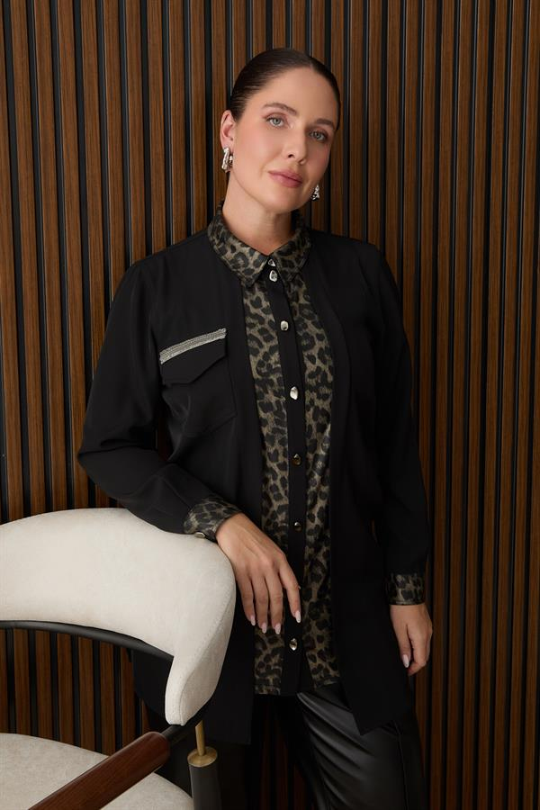 Almila Gömlek Kesim :Tam Kalıp Tarz: Klasik Boy: 87 Cm Cep Kapaklı Şerit Aksesuarlı Leopar Kumaş Detaylı Ön Kapaması Düğmeli Gömlek