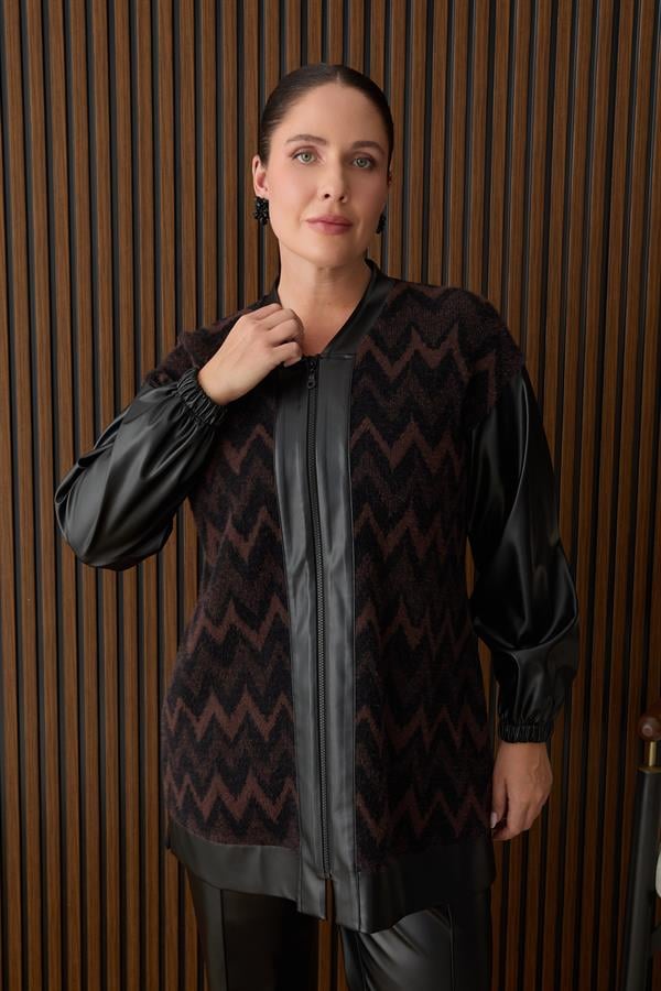 Nevra Hırka Kesim: Rahat Kalıp Tarz: Klasik Boy: 83 Cm Deri Detaylı Ön Kapaması Fermuarlı Hırka
