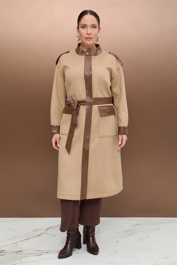 Nevra Kaban Kesim: Tam Kalıp Tarz: Klasik Boy: 120 Cm Dik Yakalı, Önü Gizli Patlı Kapamalı Cepli, Deri Garnili Kaban